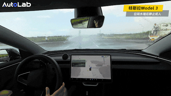特斯拉 Model 3 在减速上体验较好,早早识别并稳稳刹停,但绕行时受水墙干扰大,系统几乎立刻停滞,要求人工接管。
