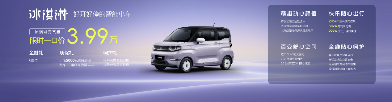 冰淇淋元气版限时一口价3.99万元,新车22kW快充搭配治愈系燕麦榛果内饰,化身萌动都市的猫系少女,为用户提供更灵动的购车选择。