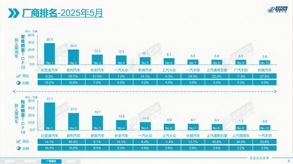 到不同品牌的表现上,自主品牌高达65.2%的零售份额显示出强劲实力,其中比亚迪、吉利和长安等头部车企贡献了超60%的市场增量,成为政策红利之外、推动车市零售创新高的另一重核心驱动因素。