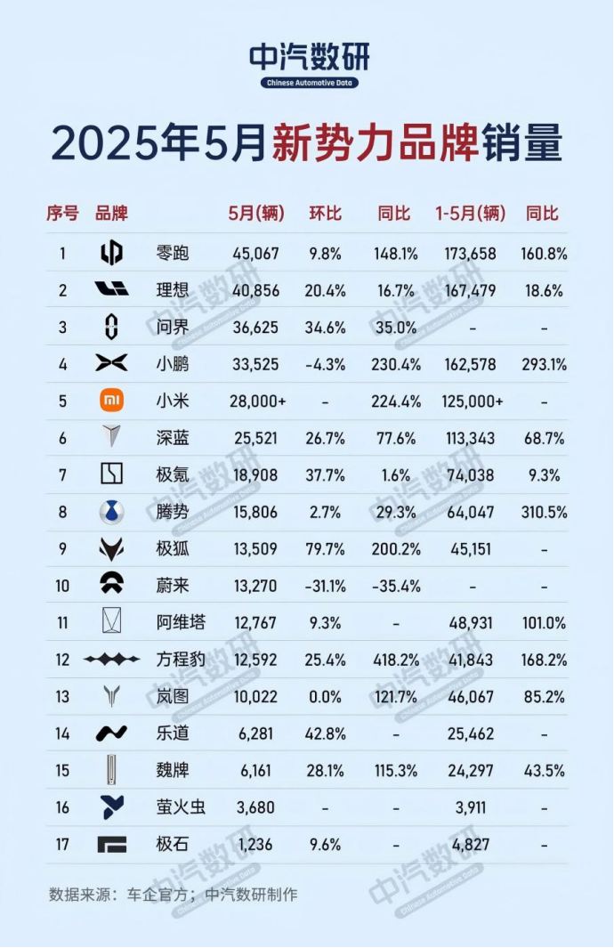 新势力品牌中,小米汽车凭借高性能产品力与生态协同快速破局,5月份小米SU7交付量超2.8万辆。整体来看,新势力品牌零售份额达20.5%,同比增长4.5%,但内部呈现明显分化,三分之一的市场被小米、鸿蒙智行、零跑、理想、小鹏占据,尾部品牌加速出局。