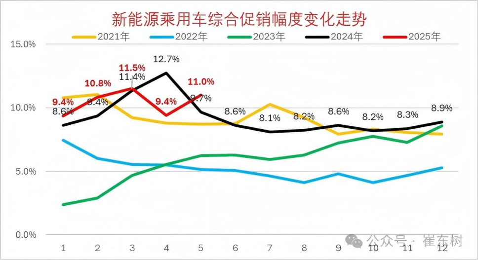 总体而言,5月车市的超预期表现是多重优惠政策持续发力、自主品牌技术升级多种因素叠加而来的结果。但崔东树在5月乘用车市场降价分析中也指出,尽管2025年整体降价促销力度明显降低,新能源车仍是价格主战场。