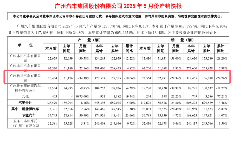 显然,按照广汽集团公布的数据来看,从2025年1月份开始,截止到2025年5月份,广汽传祺的单月销量已经接连5个月同比下滑了。