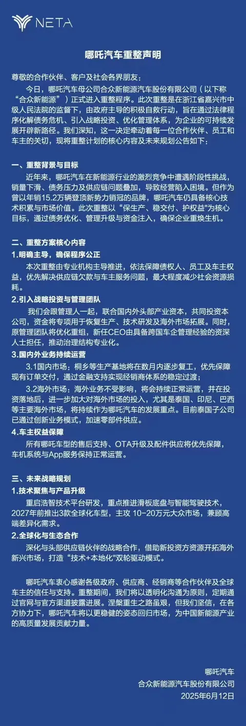 随后6月12日,哪吒汽车员工晒出一份“哪吒汽车重整声明”,声明中称:哪吒汽车母公司合众新能源汽车股份有限公司正式进入重整程序,此次重整是在浙江省嘉兴市中级人民法院的监督下,由政府主导的积极自救行动,旨在通过法律程序化解债务危机、引入战略投资、优化管理体系,为企业的可持续发展开辟新路径。