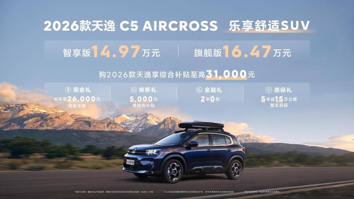 6月16日,东风雪铁龙2026款天逸C5 AIRCROSS 焕新上市,共推出智享版和旗舰版两个版本,指导价分别为14.97万元、16.47万元,相较现款直降至高5000元,同时购车综合补贴至高31000元,真正实现"增配增值价更低,冠军品质轻松享"。