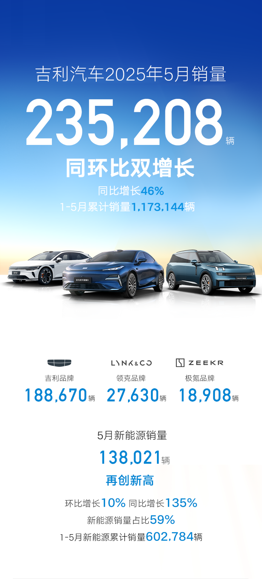 6月1日,吉利汽车公布了5月销量数据,乘用车销量达235,208辆,同比增长46%,展现出强劲的市场增长势头;不仅如此,1-5月累计销量数据更是亮眼,为品牌发展奠定了坚实基础。尤其是新能源销量表现更是十分突出,5月销量达138,021辆,同比增长135%,稳居新能源市场第一梯队。