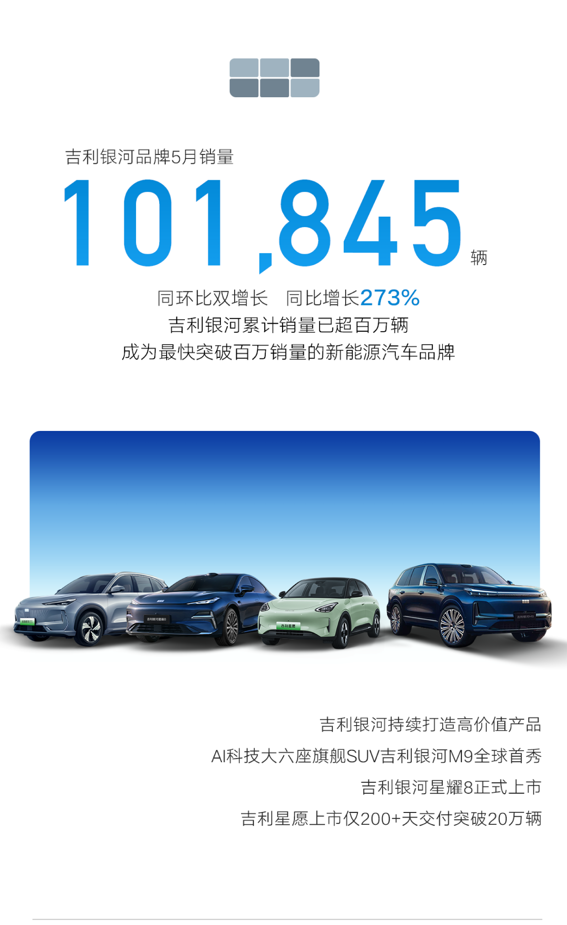 吉利银河作为独立品牌,5月销量再创新高,达到101,845辆,旗下吉利星愿、银河E5、银河星舰7 EM-i及新上市的银河星耀8等多款车型热销,共同联手推动品牌销量攀升。不仅极氪、领克品牌取得同样的好成绩,海外市场方面,5月出口销量也是稳步增长。