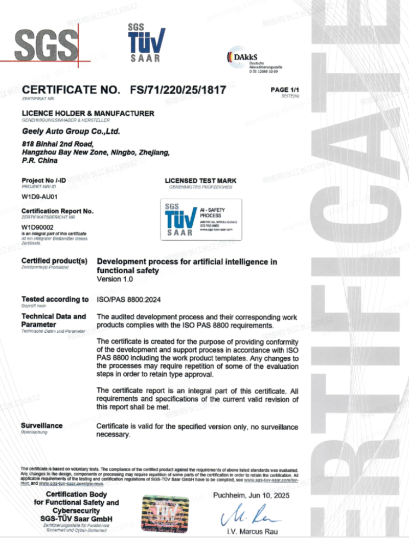 近日,经过国际公认的测试、检验和认证机构SGS审核,吉利汽车ISO/PAS 8800道路车辆安全与人工智能体系和能力获得欧洲DAkkS权威认证,成为全球首家获得ISO/PAS 8800道路车辆安全与人工智能流程认证的车企。此次认证,标志着吉利汽车完成了从功能安全、预期功能安全、人工智能安全,三大国际安全标准的工程体系和能力建设,构建全域安全体系,犹如一块敲门砖,预示着吉利汽车正加快脚步向智能化AI时代迈进。