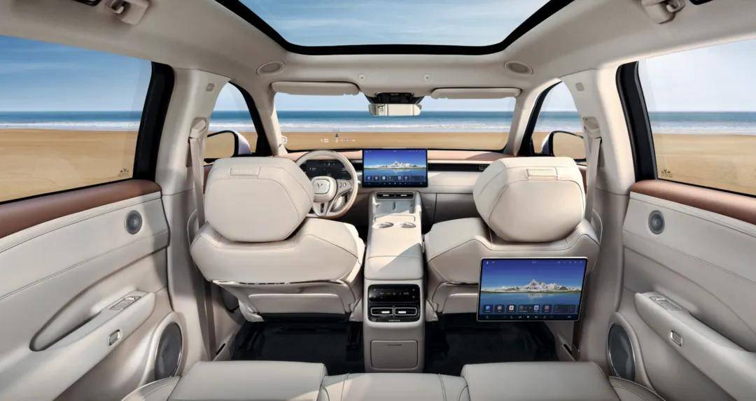 配置上更将仪式感和舒适感玩到了极致,四门电吸门,四门双层隔音隔热玻璃、前后座椅通风/加热,22扬声器Voyah Sound音响,7L容量冷暖冰箱,全景天幕,电动遮阳帘。