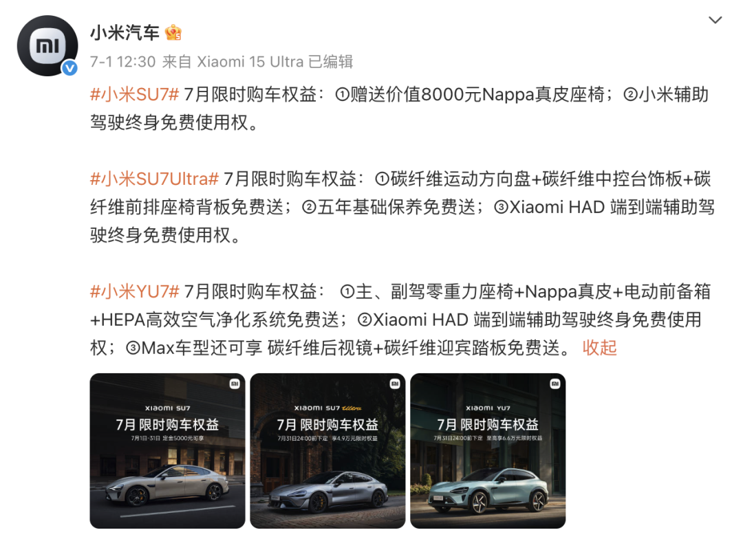 再看小米,本月小米SU7、SU7 Ultra继续延续了此前的政策;