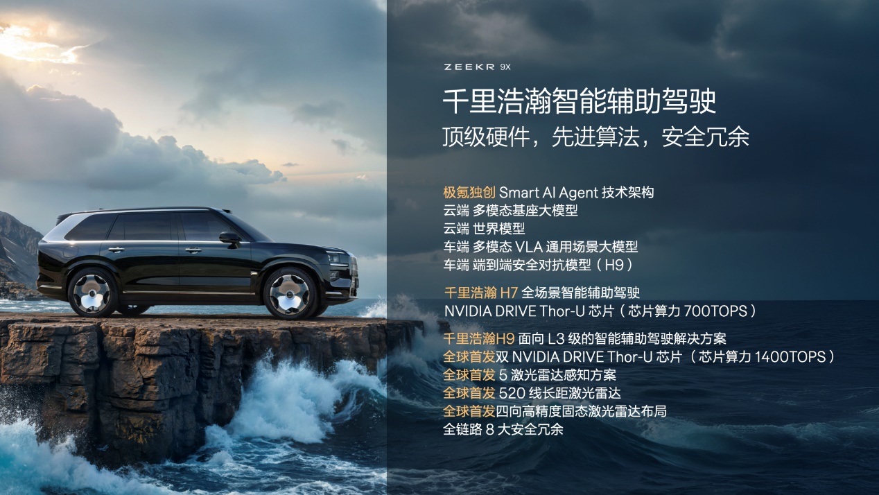 面向L3级的千里浩瀚H9通过预埋顶级硬件,实现了芯片、感知硬件、算法等全链路8大安全冗余设计,更搭载行业首发的双NVIDIA DRIVE Thor-U芯片,总算力超过1400TOPS,算力双备份。同时,千里浩瀚H9采用行业唯一5激光雷达方案,首次实现激光雷达360度全覆盖,是全球唯一真正实现「全域、全向、全时」无盲区的感知方案。此外,千里浩瀚H9还部署了独创的「端到端安全对抗模型」,第一次实现「双端到端大模型」算法的互相验证,算法双保障。