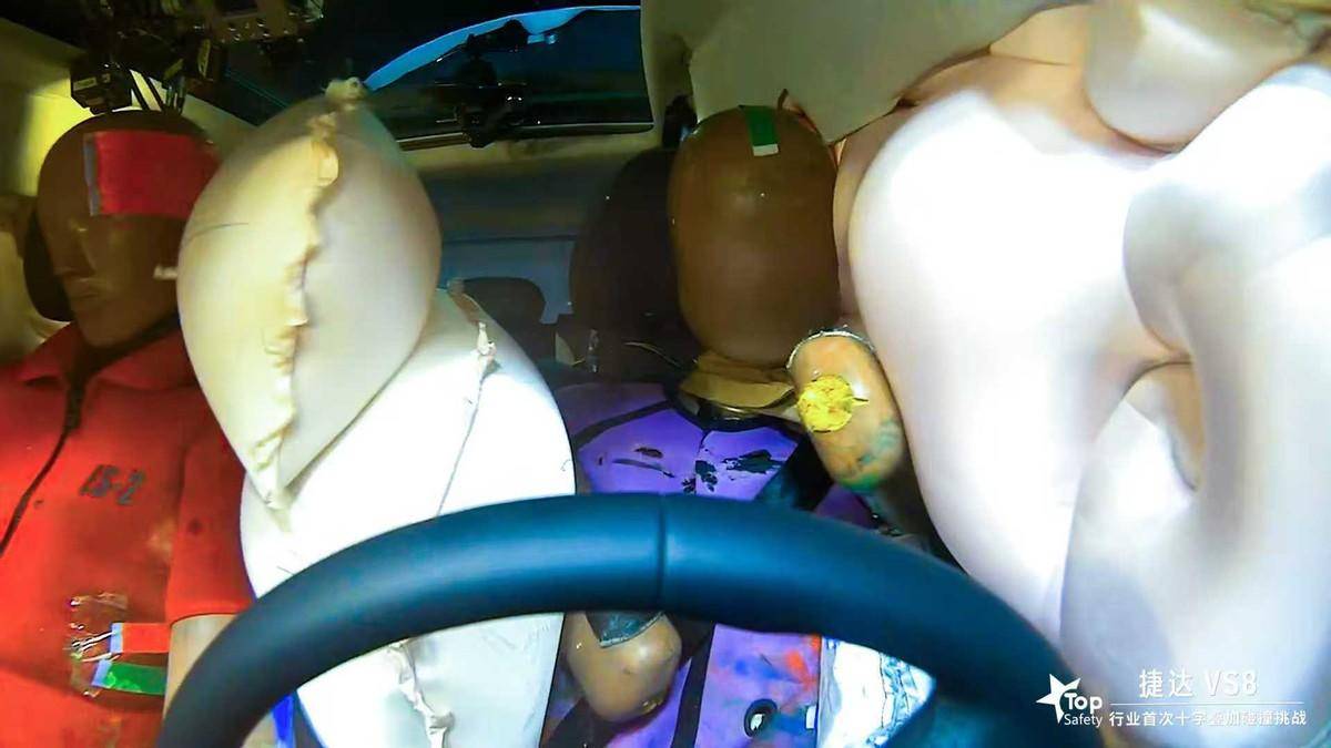 这种 “非对称、叠加态” 的测试,比常规测试严苛得多。常规侧撞测试中,车辆是 “完好状态” 被撞击,而捷达 VS8 在第一次追尾后,车身纵梁、后围板已发生形变,相当于 “带伤作战”。此时 A 柱、B 柱能否顶住冲击?气囊能否在车身姿态不稳时精准弹出?这些细节,才是家庭用户在极端事故中 “能不能活下来” 的关键。