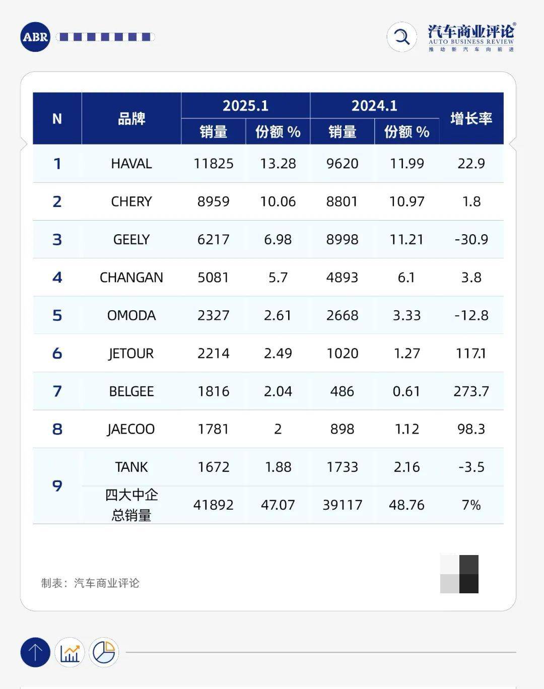 高速增长的转折点发生在2024年第四季度,中国品牌份额开始下行。俄罗斯分析机构Autostat数据显示,2025年1月,4大中国车企在俄总计销售41892辆,同比增长7%,市场份额为47.07%,同比下降1.69个百分点。