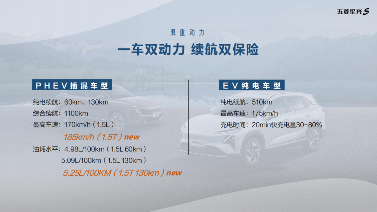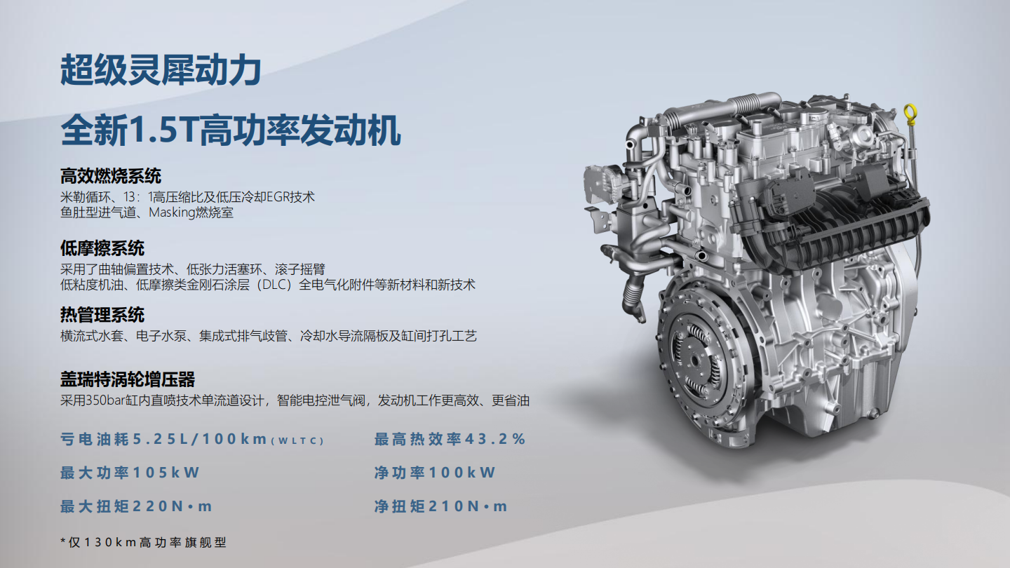 动力方面,PHEV车型新增1.5T高功率发动机,最大功率105kW、最大扭矩220N.m,最高热效率43.2%。综合续航超1100km。1.5L自然吸气版本则提供78千瓦的最大功率,电机最大功率150千瓦,CLTC纯电续航里程分别为60公里和130公里;纯电版车型电机最大功率为150千瓦,采用单电机,配备磷酸铁锂电池组,CLTC纯电续航为510公里。