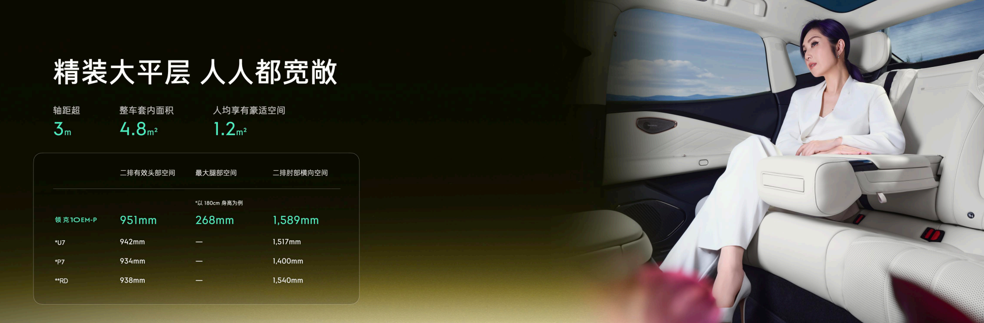 在豪华配置上,领克10 EM-P同样下足了功夫。全车软包面积高达18㎡,Nappa真皮触感细腻高级。位于中央扶手区的5.7L 冷热一体车载冰箱具备独立压缩机,温度调节范围宽泛,制冷制热都好用。总功率高达1600W、支持7.1.4多声道的哈曼卡顿23扬豪华音响配合行业首创的启幕升降式出风音响以及卧室级的NVH表现,为用户带来了最高级的音乐享受。