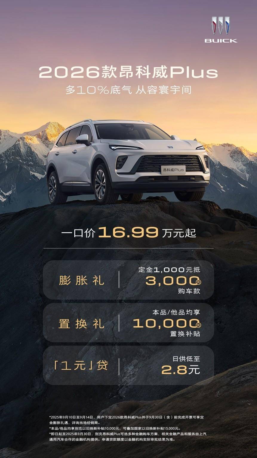 即日起,用户购买2026款别克昂科威Plus在“一口价”基础上,可叠加“0.99%起低息方案”、“1元贷”等专属金融方案;本品/他品置换均可享受10,000元品牌置换补贴,并同时叠加至高15,000元国补。此外,凡在9月10日至9月14日(含)期间下订的用户,还可享受1,000元抵3,000元的限时“膨胀金”礼遇。