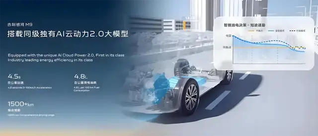 吉利银河M9搭载由1.5T插混专用以及三电机四驱组成的全新一代雷神EM-P AI电混,系统综合功率超过400kW,0-100km/h加速时间为4.5秒,CLTC工况下馈电油耗仅为4.8L/100km,综合续航超1500km。三电机的加持还实现了掉头半径仅3.45米的华尔兹式掉头和漂移泊车等极致操控。