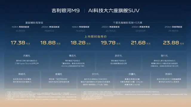 9月17日,吉利银河M9正式上市,共推出6款车型,叠加限时超级置换金10000元权益后的上市限时指导价为17.38万元-23.88万元。与此同时,吉利银河官方还带来了限时赠送7000元“魔毯星驰”套装选装抵扣券、吉利系老客户本品置换限时享30000星积分的焕新礼、限时享“12万3年0息”的金融礼等多项购车权益,详情请见下图: