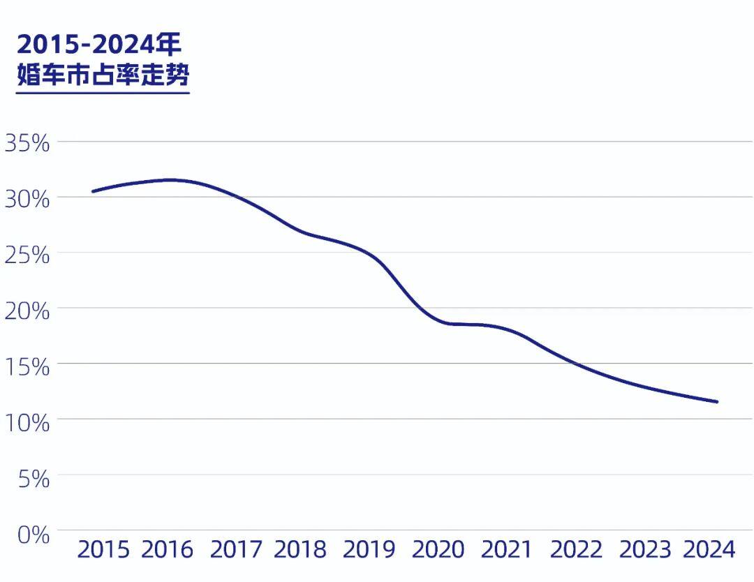 腾易研究院8月发布的《中国购车家庭收支洞察报告之结婚篇(2025版)》(以下简称报告)显示,婚车年销量自2016-2017年峰值的七百万辆级,滑落到2023-2024年的不到三百万辆级,占乘用车总销量的比重从“三成多”退到“一成多”。