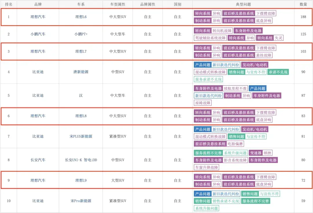 据国内某汽车质量投诉平台统计,今年8月新能源汽车投诉量排名Top10中,理想汽车一家就占据4个席位,L6、L7、L8、L9无一缺席。而且问题出奇一致,均涉及转向系统、制动系统、下摆臂这些直接关系到车辆行驶安全、驾驶体验的部分。