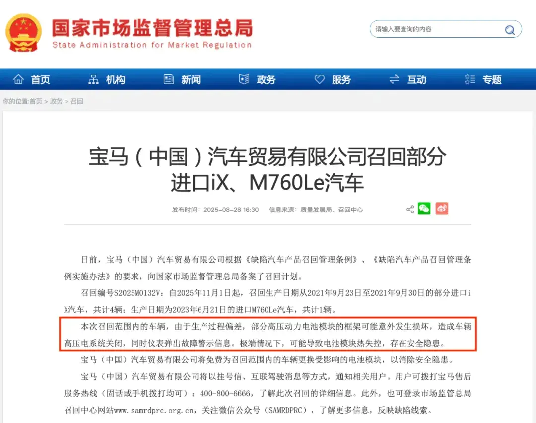宝马中国最近召回部分进口iX和M760Le车型,原因就是“生产过程偏差”,导致部分高压动力电池模块的框架可能意外发生损坏。
