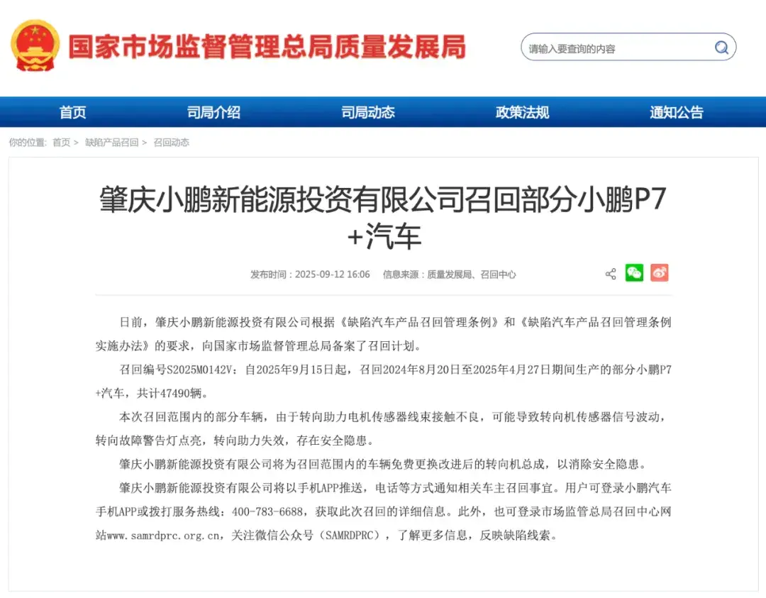9月12日,国家市场监督管理总局官网显示,自9月15日起,小鹏汽车召回约4.75万辆小鹏P7+,这一数字创下中国造车新势力单次线下召回规模的纪录。