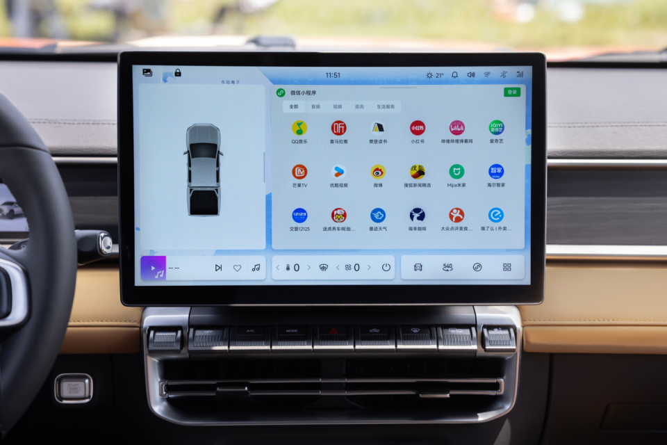 在智能驾驶上,威麟R08还给用户带来“上帝视角”——540°全景影像。它融合360°环视和180°底盘透视,能像无人机一样俯瞰车辆周边与底部,连井盖坑洞都能看得一清二楚。在实际用车场景中,540° 全景影像优势尽显。窄巷会车时,可实时预测左右车轮轨迹,进行毫米级距离显示,驾驶者无需掰动后视镜,也能避免刮蹭;越野时,借助底盘透视,能直接看穿地面,提前避开石头、暗坑等障碍物;泊车时,凭借 360° 无死角视野,新手也能秒变“老司机”,轻松实现一把入库。