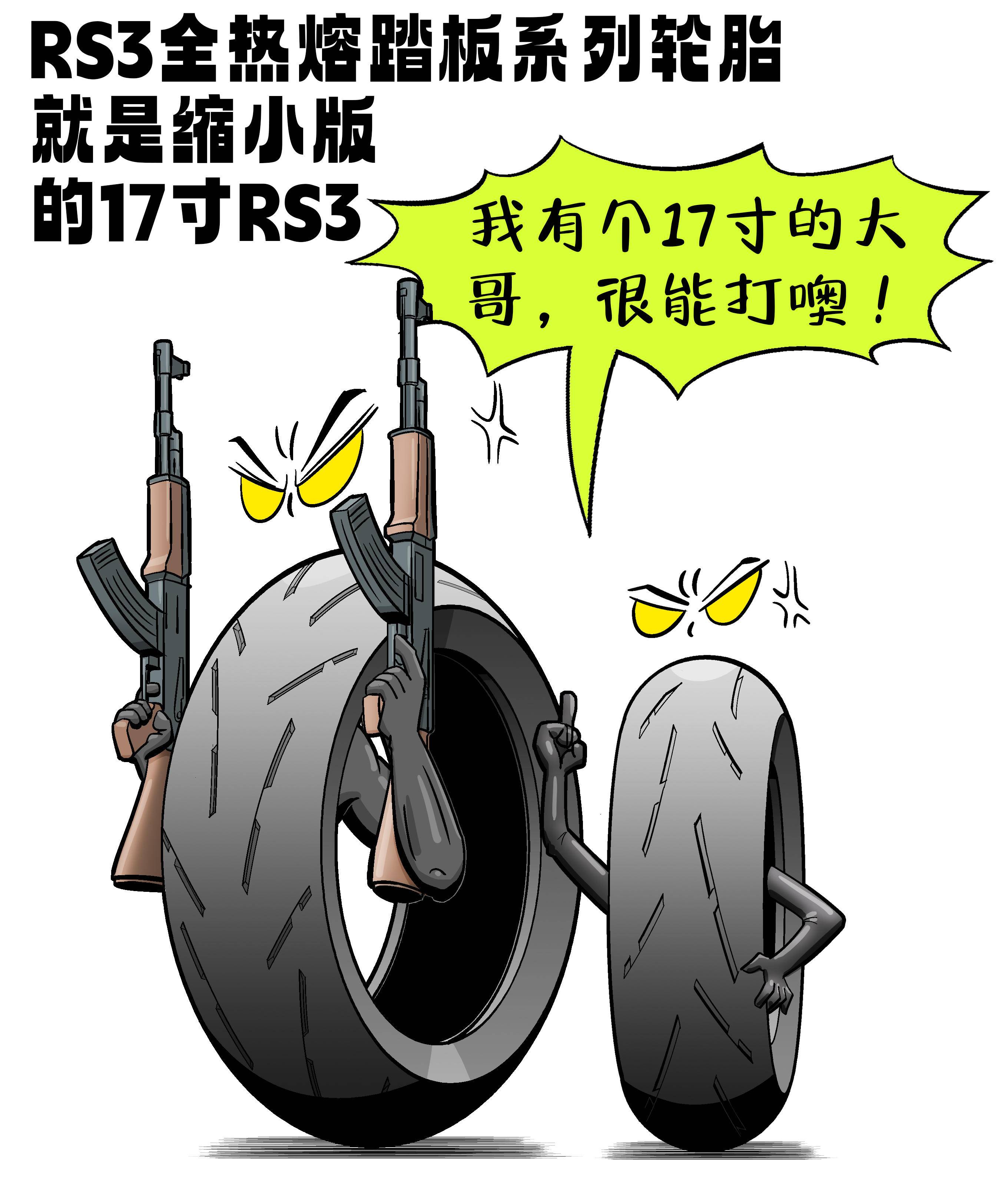 踏板车用的RS3胎纹和17寸的RS3相差无几。另外仿真技术导入,优化踏板赛事胎型,动态仿真技术设计,使轮胎和地面的摩擦力得到最大化利用,从而提供出色的抓地力,提升过弯抓地力和稳定性。