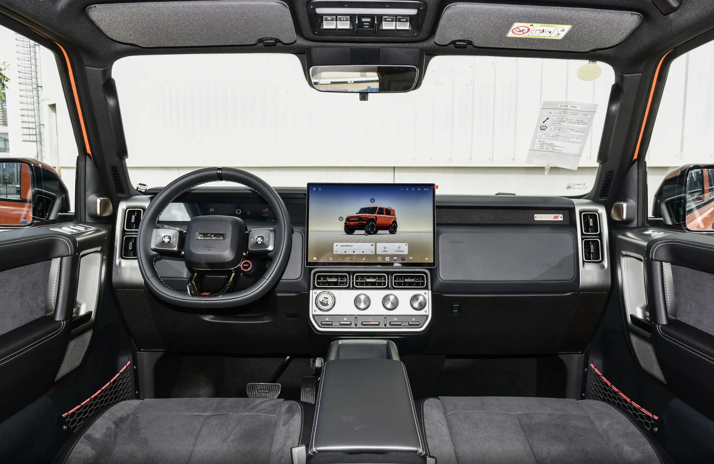 进入车内,实际上整体的设计风格依旧延续老款车型的整体设计,对称的布局,大面积矩形以及平直线条的应用,确实符合其产品定位,不过新车还是在很多细节处进行微小修改,最直观的便是配上了8.8英寸的液晶仪表,并且中央15.4英寸的车机也内置了8155芯片,整体智能、交互表现更好,同时iCAR全新超级V23 S方向盘上增加了红色回正标识以及Boost按键。