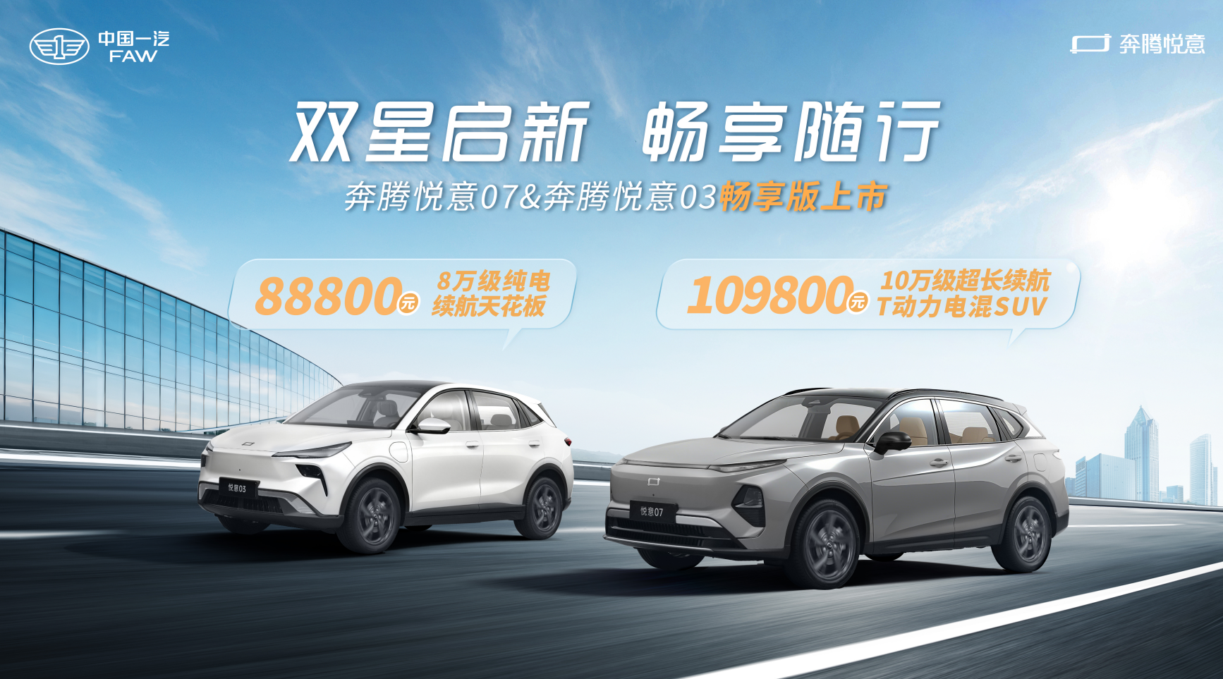 畅享长续航,击穿质价比!9月23日,一汽奔腾“悦意双子星”奔腾悦意07、奔腾悦意03畅享版正式上市。其中,“超长续航T动力电混SUV”奔腾悦意07 210km畅享版售价10.98万,“大大大纯电家享SUV”奔腾悦意03 565km畅享版售价8.88万,让用户以更低门槛享受更大出行自由。