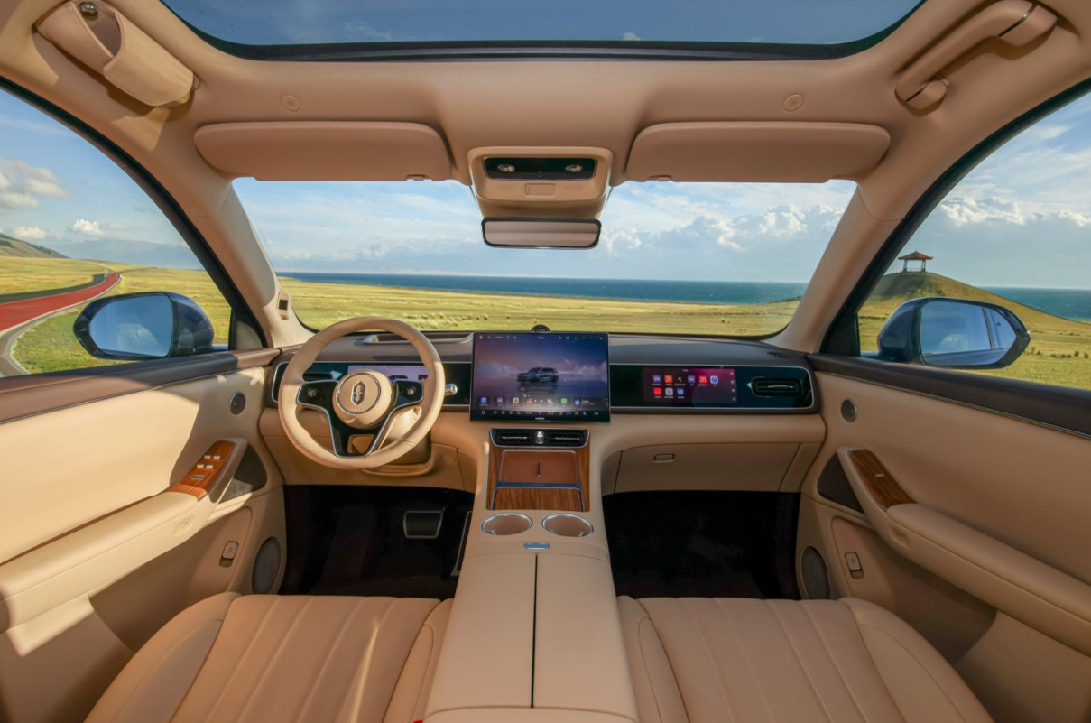 中控台布局也焕然一新,对称式设计延续了环抱式风格。中控屏尺寸为16.1英寸,分辨率达到3K,内置鸿蒙座舱操作系统,拥有众多互联功能。此外还配备了副驾娱乐屏和17.3英寸3K后排娱乐屏,照顾到车内每个乘员的娱乐需求。顶配车型还搭载华为临境抬头显示系统,能投射丰富的行车信息至驾驶员视野,行车指引更精准。