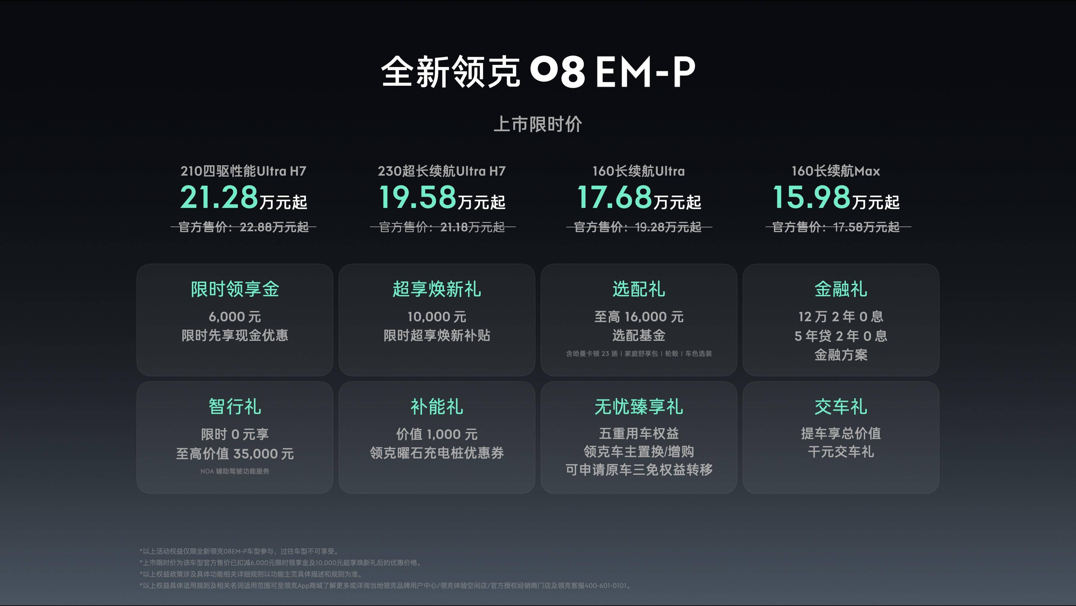 【英俊的车车报道】今日,“家庭豪华智混SUV”全新领克08 EM-P正式上市。新车提供160长续航Max、160长续航Ultra、230超长续航Ultra H7、210四驱性能Ultra H7四款车型可选,官方限时价15.98万元-21.28万元。同时,伴随新车上市还有限时领享金、超享焕新礼、选配礼、金融礼、智行礼、补能礼、无忧臻享礼、交车礼在内的8重限时福利。