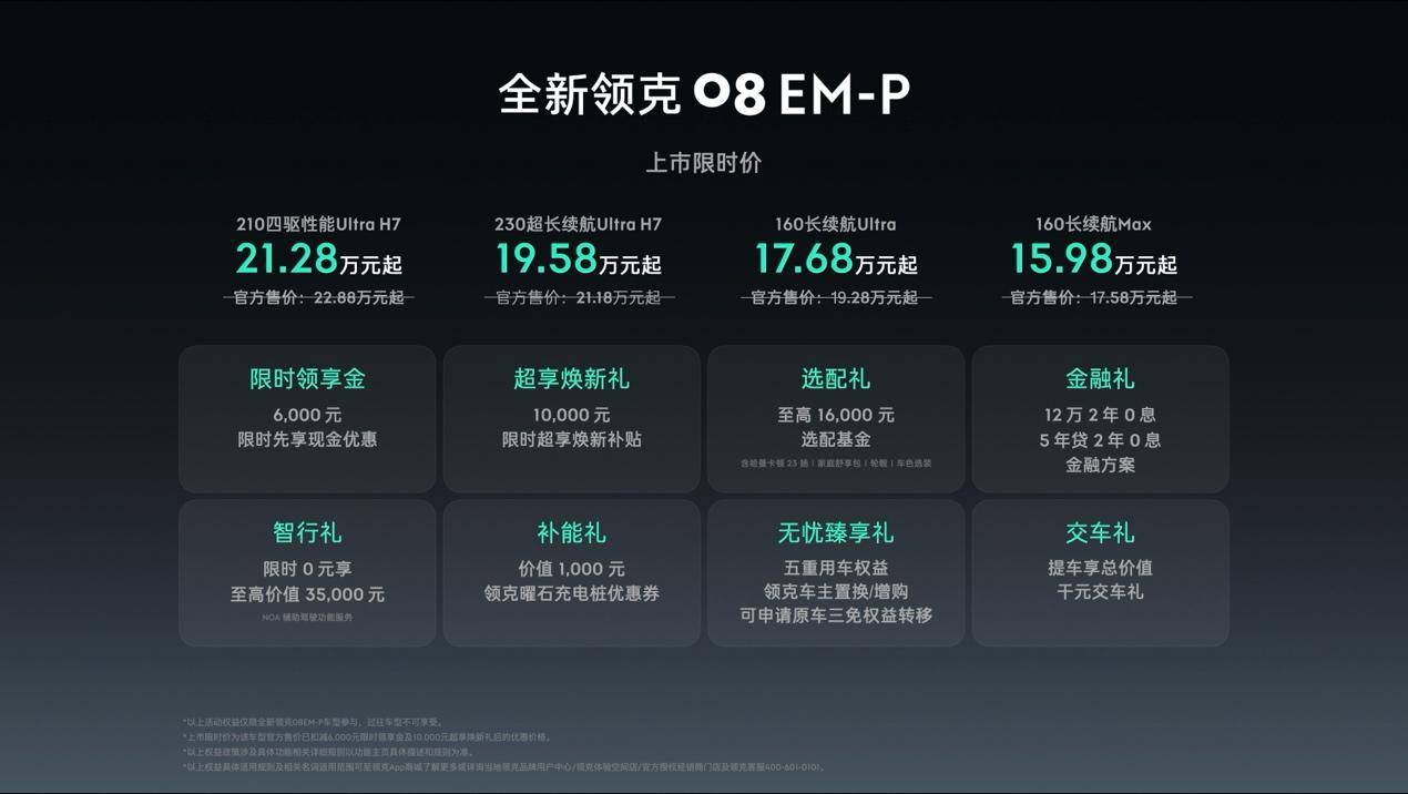 2025年9月24日,领克品牌在上海正式发布了全新领克08 EM-P。这款车型是领克电动化战略中的核心产品,以其极具辨识度的原创设计、行业领先的智能座舱系统以及强大的动力和安全配置,引起了广泛关注。新车提供四款车型,官方限时指导价为15.98万元至21.28万元,并推出一系列购车优惠活动,进一步提升了其市场竞争力。