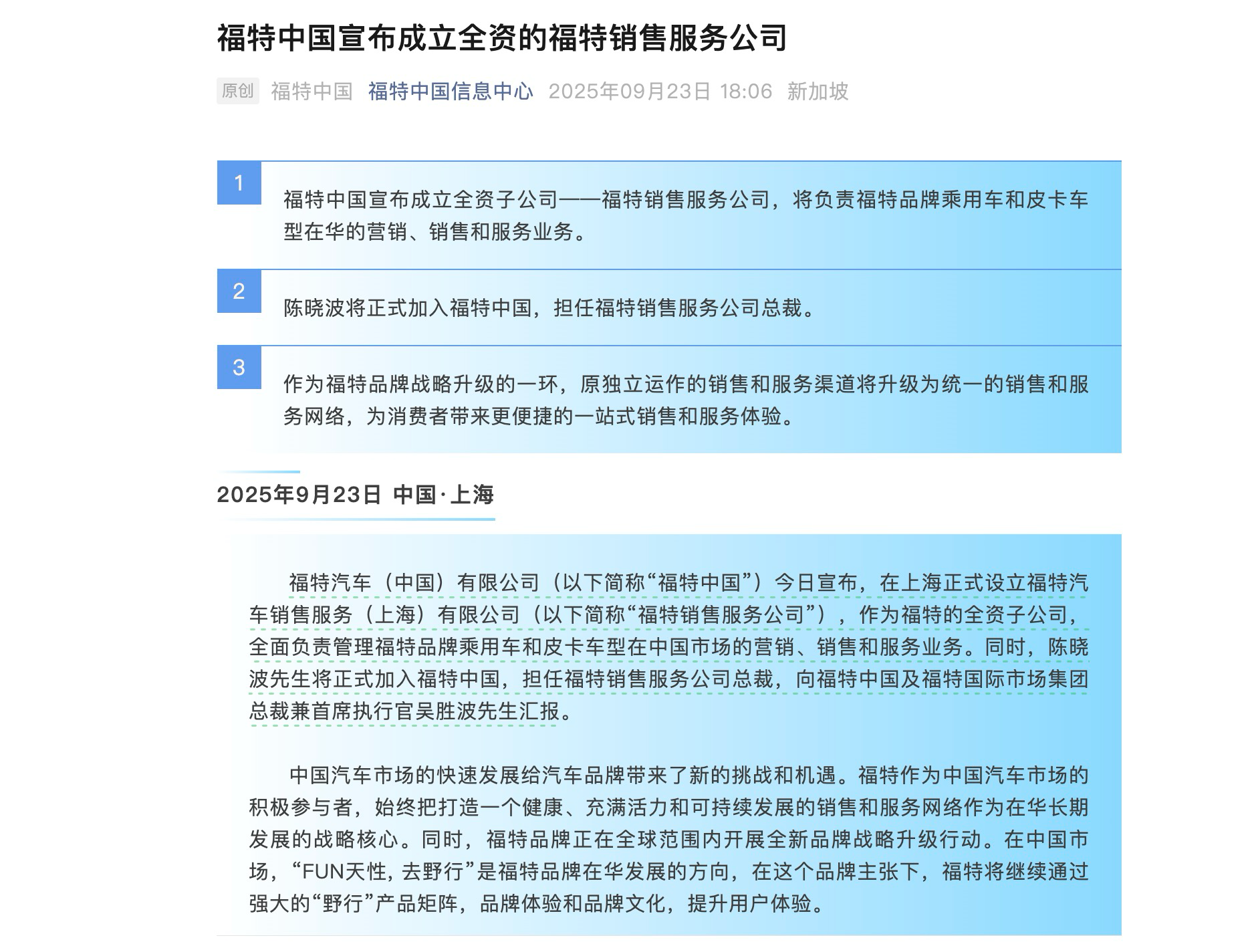 9月23日,福特中国宣布在上海正式设立福特汽车销售服务(上海)有限公司,作为福特的全资子公司,全面负责管理福特品牌乘用车和皮卡车型在中国市场的营销、销售和服务业务。与这一重大战略发布同时公布的是人事任命:陈晓波将正式加入福特中国,担任福特销售服务公司总裁,向福特中国及福特国际市场集团总裁兼首席执行官吴胜波汇报。这一任命将于2025年10月1日新公司正式运营时生效。