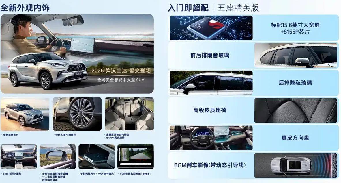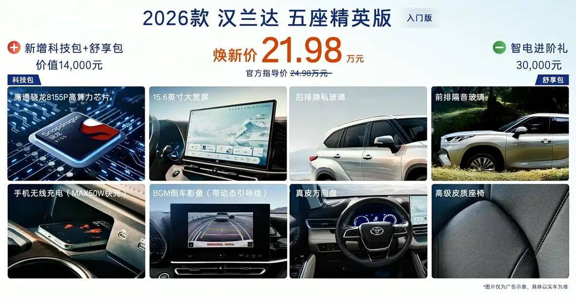 以2026款汉兰达五座精英版为例,新车焕新价21.98万元,但增加的配置却有高通骁龙8155芯片、15.6英寸中控大屏、后排隐私玻璃、前排隔音玻璃、50W手机无线充电、带动态引导线的倒车影像、真皮方向盘、高级皮质座椅等功能。