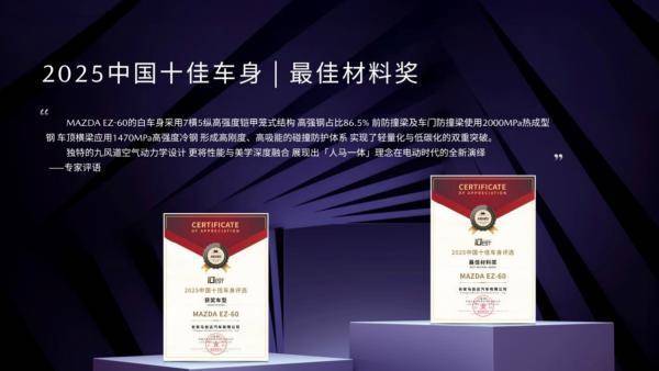 就在前不久,马自达EZ-60在“勇士之路”丙察察成功完成行业首个“整车碰撞/翻滚/浸水”连环挑战,并荣获中汽中心颁发的“TOP Safety”顶级安全证书,展现出卓越的安全性能。同月,再次斩获“2025中国十佳车身”及“最佳材料奖”两项大奖,可以说树立了新能源中型SUV安全领域的新标杆。