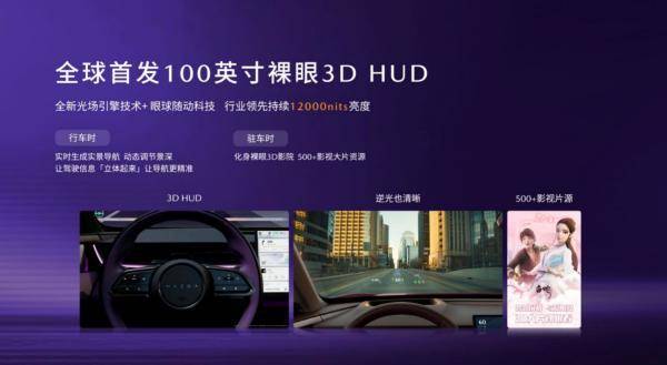 另外,车机内置豆包和讯飞星火两个AI大模型,不管是导航、控车,还是陪玩聊天,样样在行。同时,全球首发100英寸裸眼3D HUD,将车载HUD视觉技术推向全新高度。在驻车模式下,该功能还能化身裸眼3D影院,配合23扬声器和杜比全景声音效,还能带来沉浸式的观影体验。