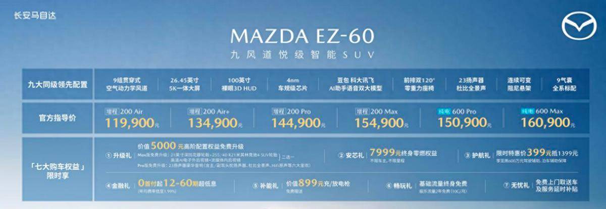今日(9月26日),市场预热许久的长安马自达EZ-60迎来了正式上市,新车推出纯电、增程两大动力共6款配置车型,售价区间为11.99-16.09万元。与此同时,官方还推出了7大购车权益以及5000元限时权益免费升级,可以说诚意十足。