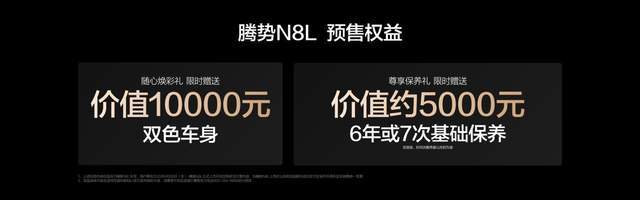 此次预售,腾势N8L还拿出了实打实的诚意:预订就能拿到价值10000元的双色车身焕彩礼,还有价值5000元的6年/7次基础保养(含首保)。这不是简单的促销,更像是给家庭用户的"见面礼"——毕竟对爸妈来说,"能省点保养钱"也是很实在的好处。