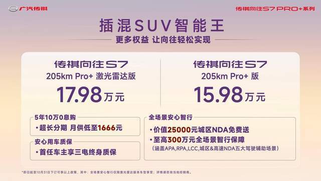 同时,作为向往系列第一车,传祺向往S7全新Pro+系列售价15.98万元起,更带来传祺史上最给力的金融政策:5年10万0息,月供低至1666元,还有价值25000元城区NDA免费送、至高300万元全场景智行保障,首任车主还可享三电终身质保,真正让“向往的生活”触手可及。