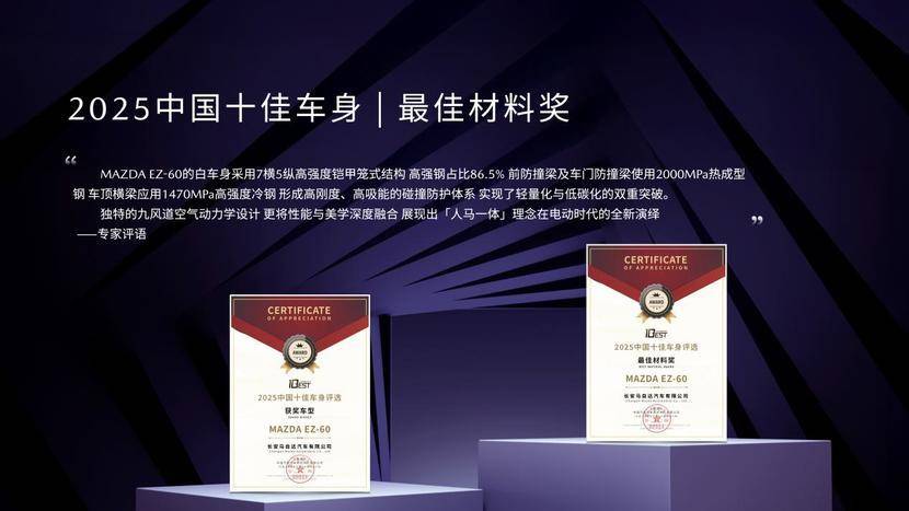 安全是马自达刻在骨子里的DNA,是所有驾乘愉悦的前提。EZ-60通过“实战测试+权威认证”双维度,树立了新能源中型SUV安全领域的新标杆,为用户的每一次出行保驾护航。9月,EZ-60在“勇士之路”丙察察成功完成行业首个“整车碰撞/翻滚/浸水”连环挑战,并荣获中汽中心颁发的“TOP Safety”顶级安全证书,展现出卓越的安全性能。同月再次斩获“2025中国十佳车身”及“最佳材料奖”两项大奖。