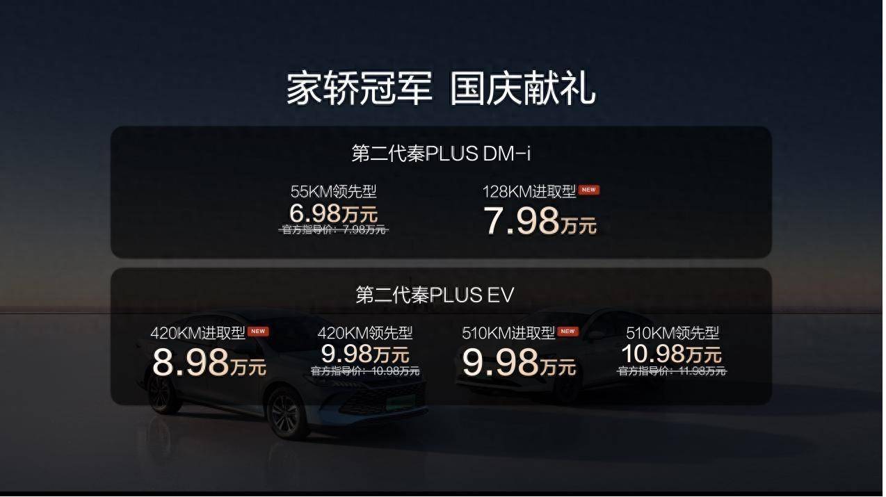 9月25日,比亚迪第二代秦PLUS双车上新,发布了秦PLUS DM-i 128KM进取型、秦PLUS EV 420进取型、510KM进取型等三款新车,同时全系车型享国庆献礼价,限时6.98万元起,国民家轿再度进化。