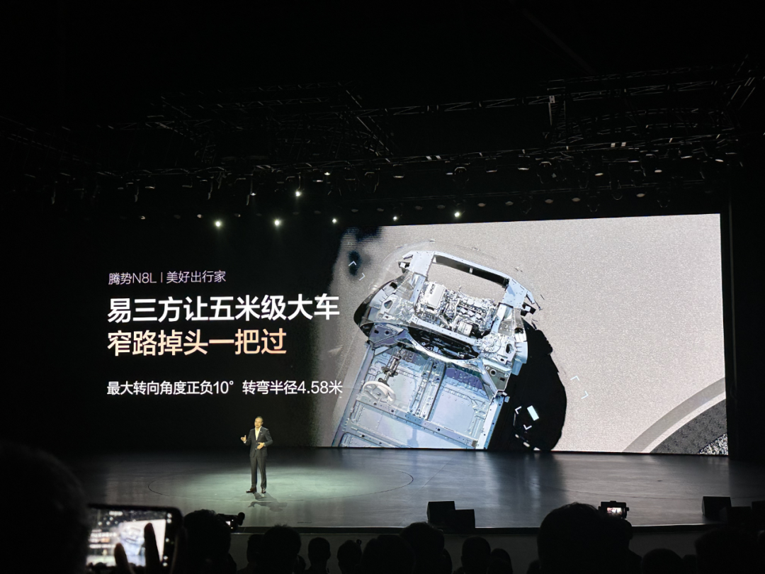腾势N8L全系标配了后轮转向,转弯半径仅为4.58m,比蔚来萤火虫还要更小。