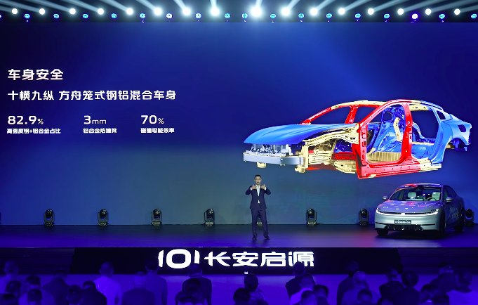 安全方面,启源A06采用“十横九纵”方舟笼式钢铝混合结构,高强度钢和铝合金占比达82.9%。前双防撞梁设计中,主防撞梁使用3毫米厚铝合金,碰撞吸能效率提升70%。