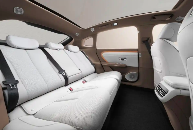 贯穿灯带采用全程无断点设计,配合可点亮车标,更有辨识度。运动轮毂配橙色卡钳,加上掀背式车顶,呈现运动姿态。此外还采用了无框车门、半隐藏式车门把手,兼顾实用与优雅,风阻也低至0.205Cd。