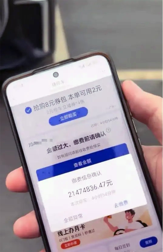 21474836.47元的停车费是二千一百四十七万八千三百六十三点四七元……就算是这辆车在随便一家景区停车场停上一年也不能要上述停车费的零头,实际怕是在妙瓦底停车也不能有如此之高的停车费。所以此次夸张的停车费数据当然不会是停车场管理方故意为之,车主遇到这种情况显然是不用慌张的;正确的做法是先联系到停车场管理方,确认系统情况之后进行准确停车费的核对和缴纳即可,一般遇到这种情况,停车场往往会免收停车费,毕竟耽误了车主的时间。