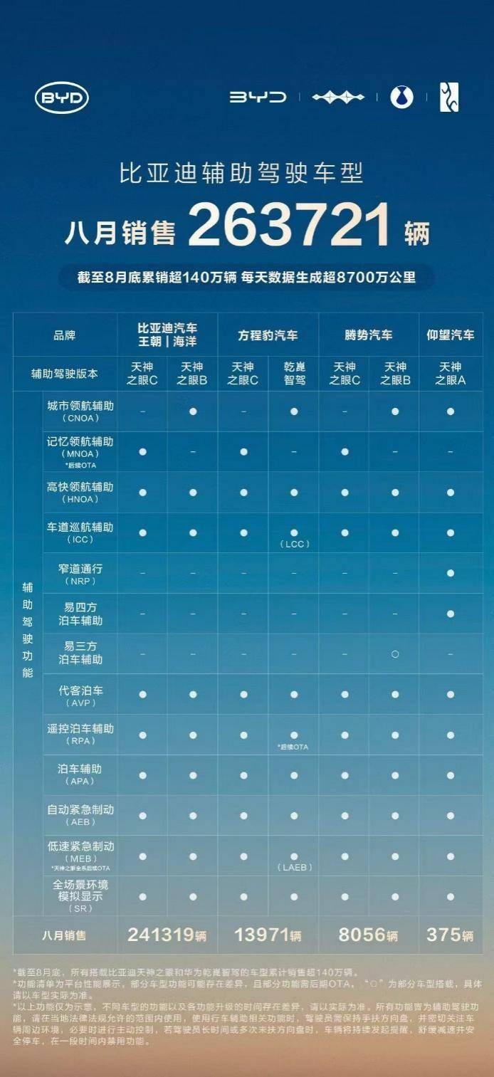 在太平洋汽车发布的8月智能驾驶辅助车型品牌销量榜中,比亚迪以26.37万辆一骑绝尘,其销量相当于第2至第10名品牌之和。