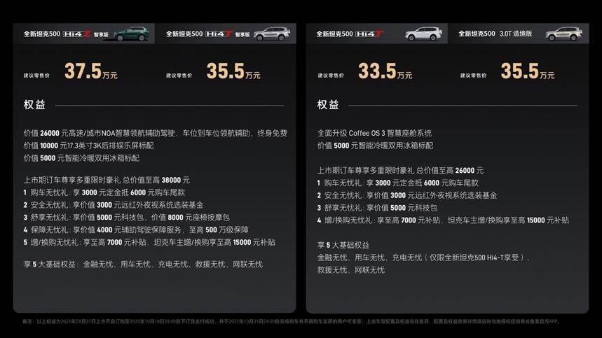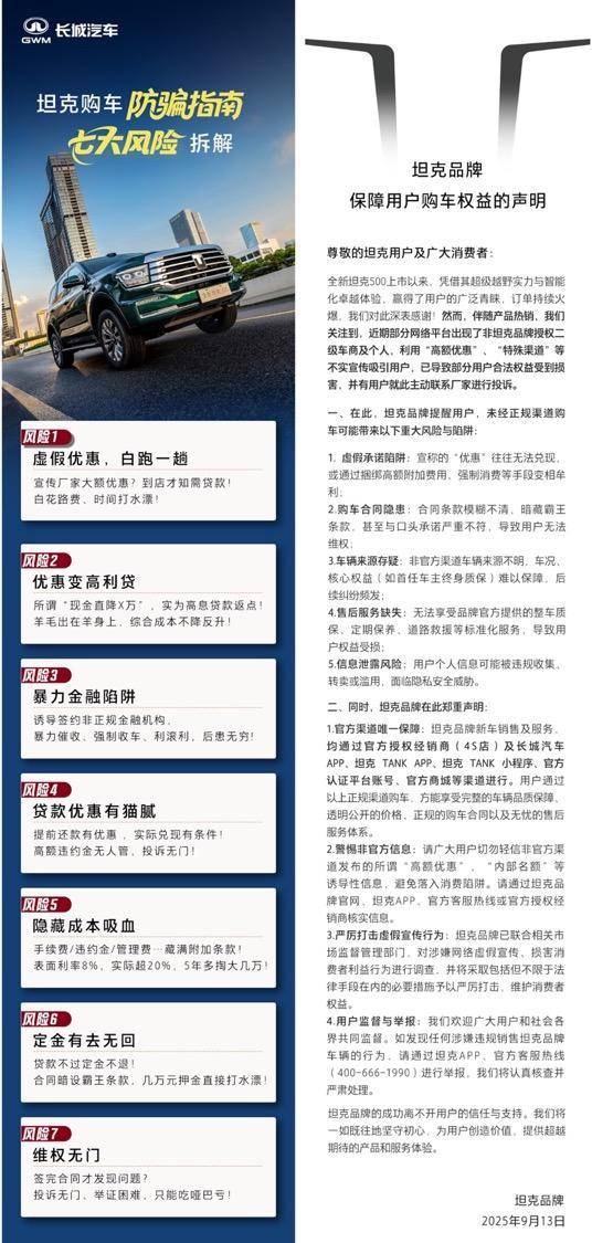 而从用户层面来看,33.5万元的起售价格,车型丰富且拥有相同诚意的权益,销量自然节节攀高。值得注意的是,伴随热销,市场上也出现了『黄牛囤车』『非官方渠道虚假优惠』等现象,对此坦克品牌第一时间发布《保障用户购车权益的声明》与《坦克购车防骗指南七大风险拆解》。