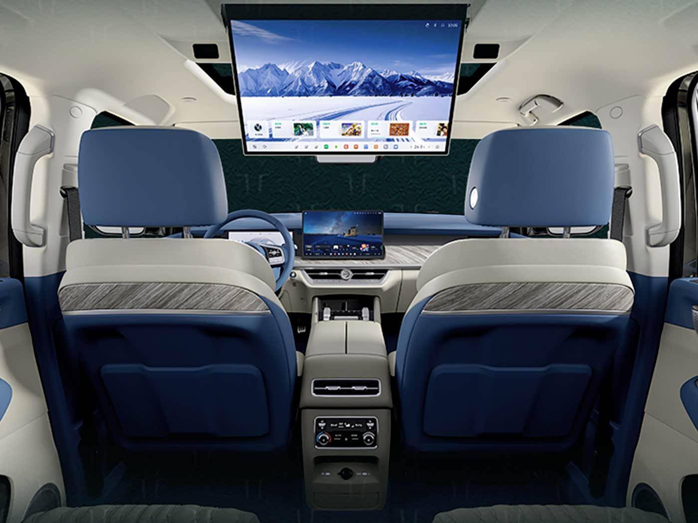 比如,前后排四个座椅都有通风、加热、按摩功能、5.4L车载冷暖冰箱以及全家人都能用的六屏交互组合等。