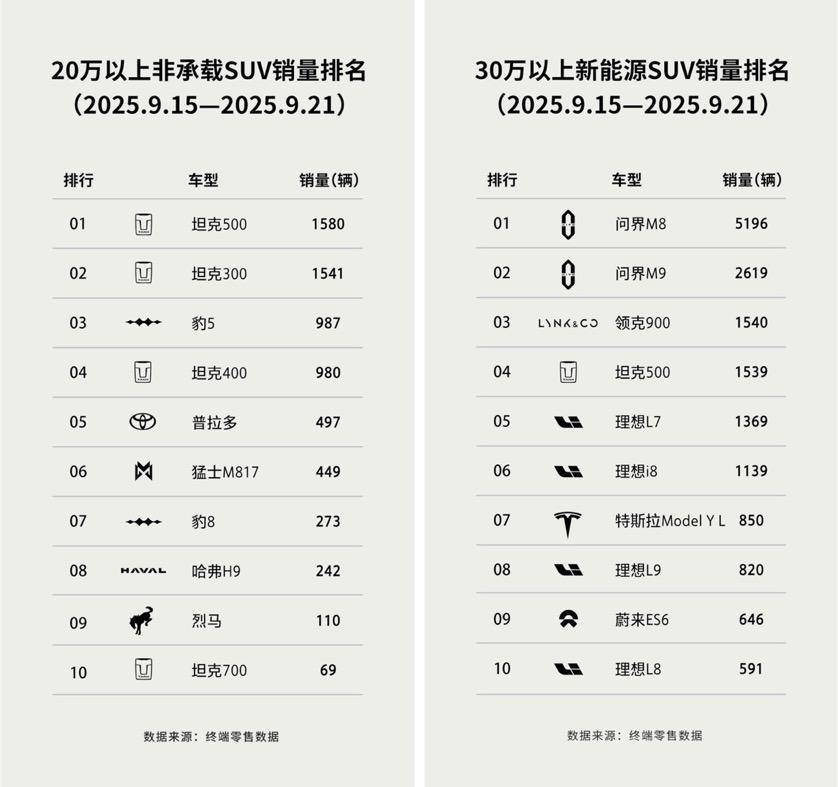 8月底,定位为『全场景智能豪华越野SUV』的全新坦克500正式上市。上市后市场反应热烈,2小时锁单突破1.2万辆。连续三周蝉联20万以上非承载SUV销量冠军,雄踞30万新能源SUV头部阵营。