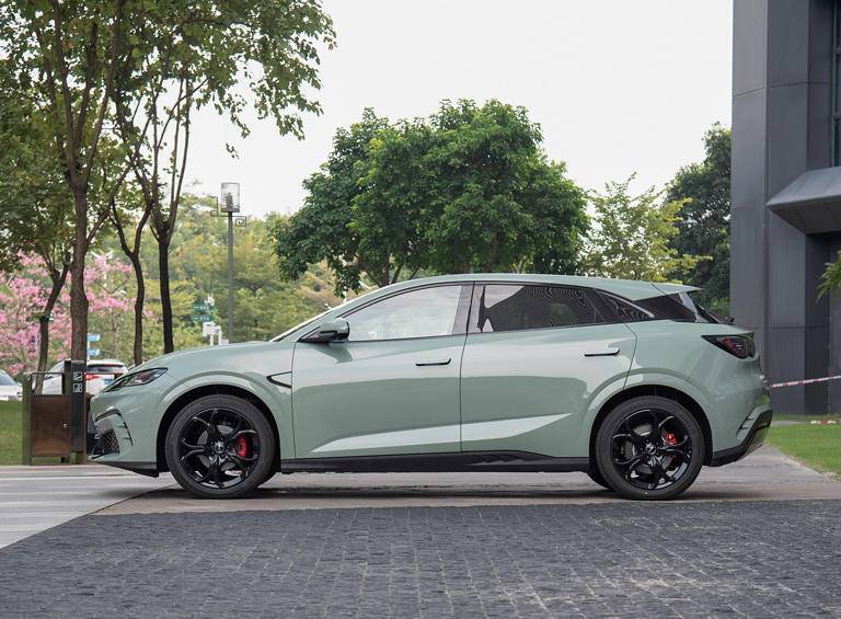 再来看新车的车身侧面部分,新车车身整体紧凑而饱满,车顶有着微微下滑式的造型来提升运动感,车窗部分也是很修长,因为宽厚D柱部分的黑色饰板分割,形成了悬浮式车顶造型来增加时尚感,车门部分也是凹凸有致的造型,饱满的视觉效果以及隐藏式的车门把手设计,整体感得到了明显的提升,外扩的轮眉还有着大面积的熏黑多幅式轮毂设计,进一步来增加运动氛围。车身尺寸方面,海豹06GT长宽高分别为4630/1880/1490毫米,轴距2820毫米。出色的轴距让新车操控起来更加的顺畅,并且腿部空间也是很宽裕。